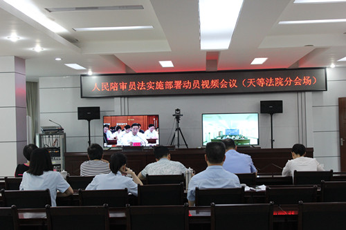 天等县人民法院组织干警参加最高人民法院、司法部联合召开的《人民陪审员法》实施动员部署视频会议